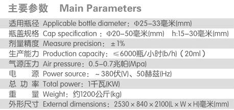 該生產線由全自動理瓶機、灌旋—體機、小瓶不干膠貼標機、全自動塑膜裹包機組成,同時可根據生產需要選配鋁箔封口機、噴碼機等。整線僅需1名操作工就能解決以往人工放瓶難、速度慢、灌裝精度低、旋蓋合格率低、貼標不正、塑膜裹包煩等困擾。