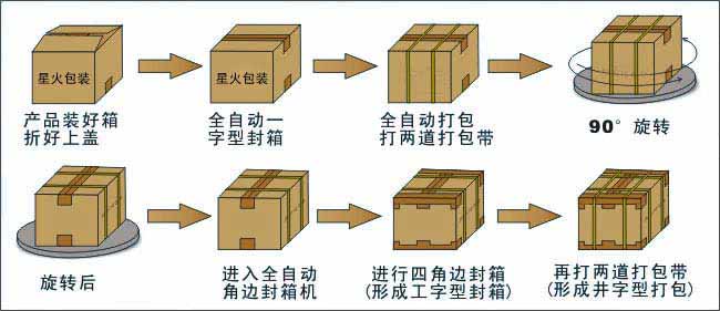 本包裝生產流水線主要操作流程:已裝好產品折好上蓋的產品箱從左邊的滾筒進入此流水線,進入一臺包裝機械:全自動一字型封箱機(進行一字型封箱)—→進入第二臺包裝機械:全自動打包機(打兩道打包帶)—→進入第三臺包裝機械:90°旋轉機—→進入第四臺包裝機械:全自動角邊封箱機(進入四角邊封箱,形成工字型封箱)—→進入很后的第五臺包裝機械:全自動打包機(打另外兩道的打包帶,形成井字形打包)—→工字型封箱+井字型打包完成。